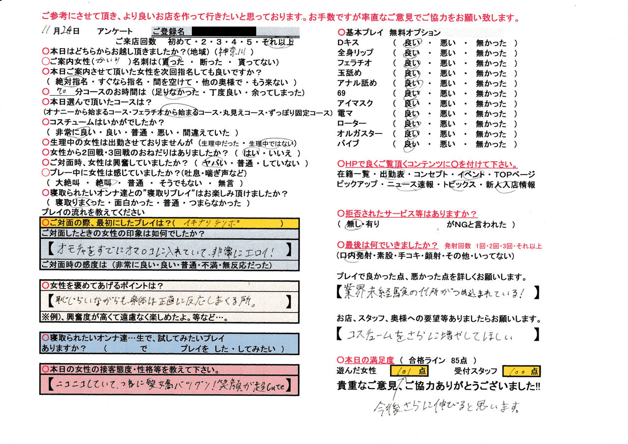 かいり 26歳 T165 B91(F) W59 H89 COMMENT 26歳の若妻が【風俗デビュー!完全業界未経験】デビューのキッカケは、旦那さんとのセ〇クスでは感じなくなってしまった事!若さと可愛らしい童顔に加え、プルルンッと思わず股間が熱くなってしまう形の綺麗な<Fカップ>巨乳の持ち主ですから、世の中の男性が放っておく訳も無く肉体関係を持つ男性もいる…ですが、この男性も淡白なセ〇クスしかしない男だったのでしっかり欲求不満になってしまったので、ドスケベな刺激を感じ、旦那の事を忘れてしまうくらい快感漬けになっちゃうような寝取られ体験をしたくて入店しちゃいました!(←くぅ~こういうの待ってました!!) ※オススメPOINT※ 多少強引な位が丁度良く押し倒されたい願望があります(*^^)vそうです…Mなのです!アイマスクで視界が無い状態で寝取られたり、拘束手枷で身体の自由が無い状態で好き勝手に弄られたり…男性が自分の身体で興奮してくれている!支配されている!と言う興奮でおま〇こを濡らしまくるオンナです♪性感帯は<耳>と息を吹きかけてあげたりドスケベな言葉を耳元でささやいてあげると乳首を勃起させ!おま〇こを大洪水状態にし!興奮度MAXで自ら刺激を欲しがるドスケベ完全体の出来上がりです(笑) 未経験でウブなオンナ特有の恥じらいながらも敏感な身体は感じ!悶える新鮮な反応が男の股間を熱くしてくれる!!やはりリアルに勝るものは有りませんね(^^♪存分に自分好みのドスケベ女へ育て上げて最高に好都合な寝取りプレイをお楽しみ下さい! 愛嬌バツグン!未経験のイイ所が詰まりまくり! 高評価アンケートはコチラ SCHEDULE 11月29日(土) -- 11月30日(日) -- 12月1日(月) -- 12月2日(火) -- 12月3日(水) -- 12月4日(木) -- 12月5日(金) -- ご予約料無料 電話する 在籍一覧 Girls List 出勤情報 Schedule コンセプト Concept 料金システム System お遊び手順 Play Guide イベント Event よくある質問 FAQ 受付所マップ Map