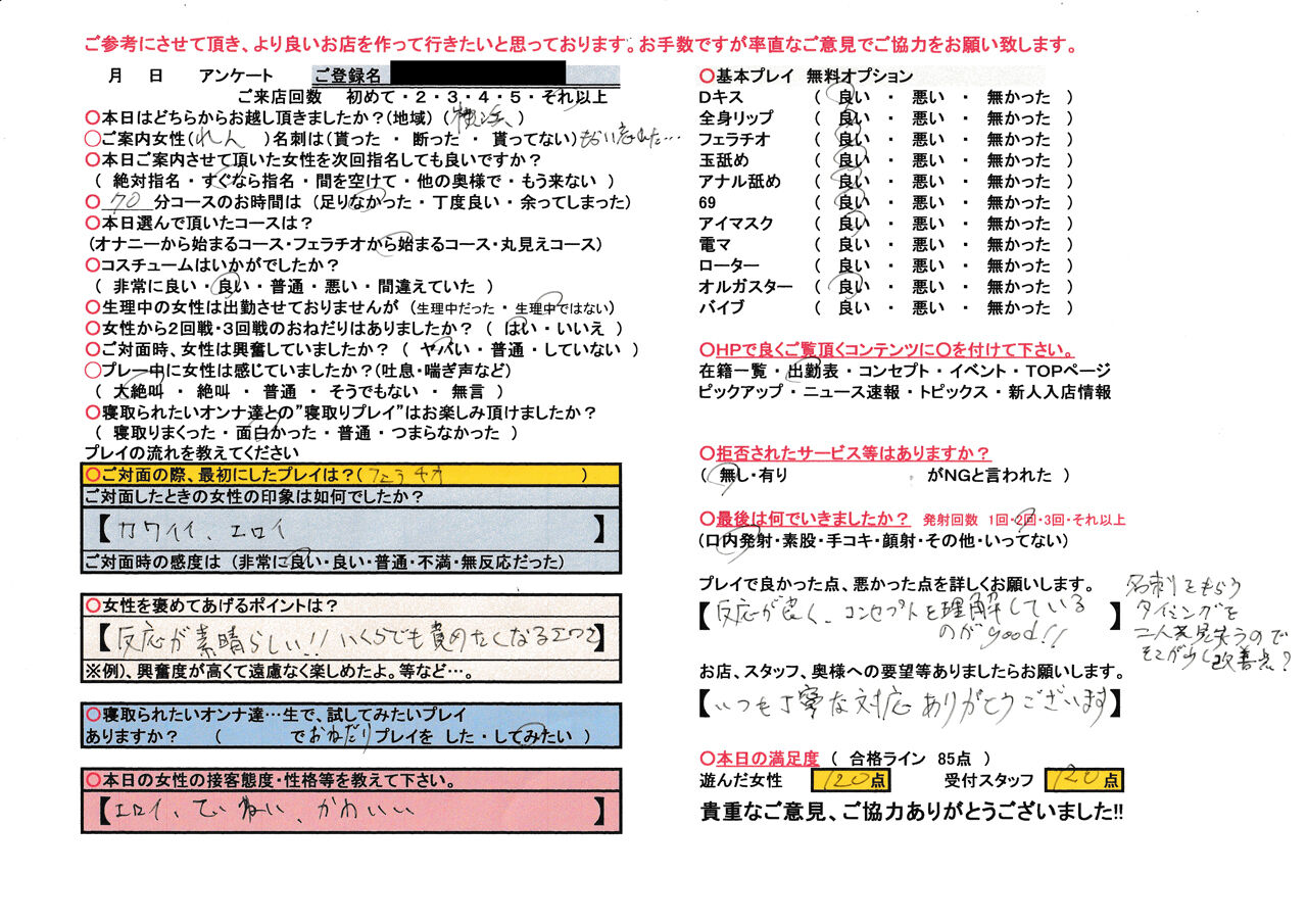 れん 34歳 T156 B94(G) W58 H89 COMMENT ≪完全業界未経験≫ドスケベ素人が一番男にとって都合が良いんですよね♪面接の時に確信しちゃいました…「この女、鉄板だ!」今の彼氏にも、過去の彼氏にも『性欲が強い』と言われて来たそうです。(自称じゃない!天然ものなのが良い!)エッチな事が大好き過ぎて時間が許される限り欲しがるオンナだから彼氏の性欲は”れんさん”を満たすには足りなかったようだ(笑)欲求不満になり、他人棒を求め当店に入店(^^♪業界未経験なのにドスケベな当店を選んじゃう当たりセンスがありますよね(笑) ※オススメPOINT※ 巨乳ファンにはたまらない『マシュマロGカップ』柔らかくてピストン時には上下左右に暴れはねまくるおっぱい('▽'*)ニパッ♪そして、何と言っても<抜群の感度>ちょっと責めてあげるだけでビクン!ビクーン!と感じおま〇こ大洪水!!性感帯は乳首&クリトリス♪乳首は強めに摘まむと凄いビク付き方をしながら悶絶!クリトリスはバイブの振動を与えてあげるとエビ反りレベルで連続絶頂↑さらに申し分ない<ドMっぷり>スパンキングして貰えばおま〇こを締め付けながら大悦び♪ご本人は自覚が無いそうですが、ちょっぴり意地悪な男性が好みと発言、相当都合の良いドM確定です(笑) 責めれば大乱れし、責めさせれば時間いっぱい尽くしまくってくれる男にとって文句の付けようがない正真正銘のドスケベです!濃厚なドスケベ体験をしたい貴方にオススメ出来る寝取られたい女です(^^♪ いくらでも責めたくなるエロさ&反応がGood! 120点アンケートはコチラ 色気抜群!ずっぽり固定でイキまくり! 高評価アンケートはコチラ SCHEDULE 1月1日(木) -- 1月2日(金) -- 1月3日(土) -- 1月4日(日) -- 1月5日(月) -- 1月6日(火) -- 1月7日(水) -- ご予約料無料 電話する SHAME