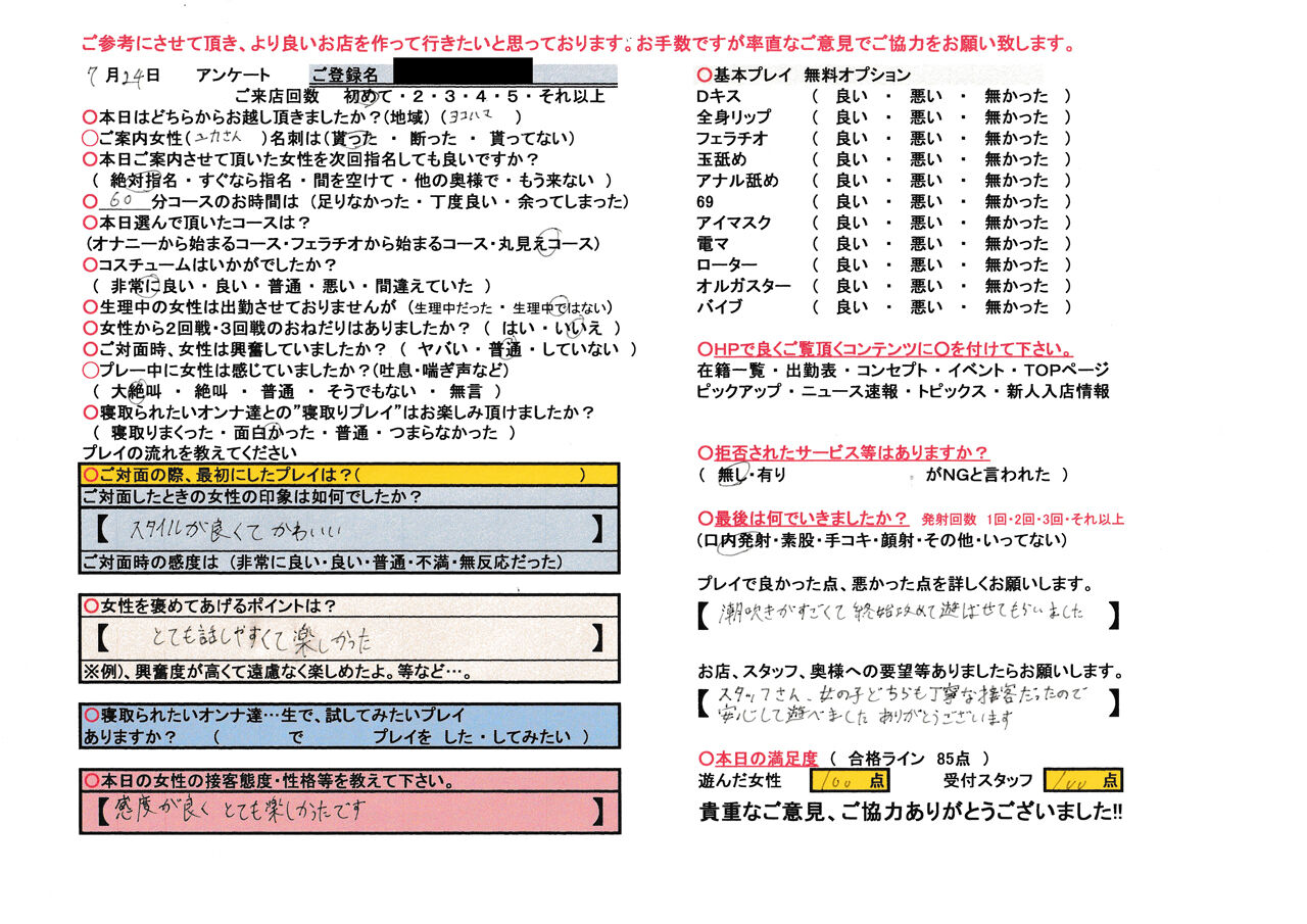 まだまだ未開発な”ゆかさん”性格も従順なタイプで育てれば育てる程、ドスケベになる天然素材!(^^)!男性の愛撫で絶頂しまくる経験をしてみたいそうで、大人のねっとりとした責めや「言葉責め」など開発されたい願望を持つウブい女!!当店で沢山の男性に寝取って貰い、もう…元の生活には戻れないように沢山虐めてあげて下さい('◇')ゞ